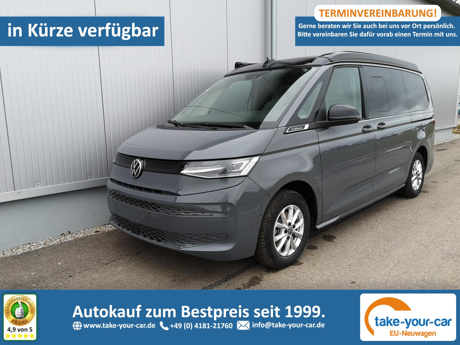 Sonstige: Zulassung als Wohnmobil, Werksanschlussgarantie auf 5 Jahre / max. 100.000 Km. Komfort und Funktion: 230-Volt-Einspeisung mit Ladefunktion für Fahrzeugbatterien, 230-Volt-Steckdose im Innenraum, 230-Volt-Steckdose mit Wechselrichter im Innenraum, Aufstelldach manuell, Faltenbalg grau mit 3 Fenstern und einer Frontöffnung, Faltenbalg in Basalt Grey, Digital Cockpit Pro, Geschwindigkeitsregelanlage elektronisch, Innenbeleuchtung Camper, LED-Hauptscheinwerfer mit LED-Tagfahrlicht, LED-Rückleuchten, Markisenschiene beidseitig in schwarz, Miniküche am Heck mit ausziehbarem einflammigen Gaskocher inkl. Technikbox mit Camper Batterie und 230-Volt-Steckdose, Campingtisch unter Bettverlängerung, 2 Campingstühle in der Heckklappe integriert, Multifunktions-Lederlenkrad mit Schaltwippen, Schlafplätze, 2 Schlafplätze im Aufstelldach oben (1.140 x 2.050 mm), 2 Schlafplätze im Wohnraum unten über gesamte Fahrzeugbreite (1.980 x 1.330 mm), Schubladen im Fahrer- und Fahrgastraum sowie unter den äußeren Sitzen inkl. 2 Abfallbehälter, Sitze, 2. Sitzreihe, 3 Einzelsitze mit Schlafauflage, Sprachsteuerung plus ICC (InCarCommunication), Schiebetür links und rechts, Verdunklungssystem mit Rollos und Gardinen, Optik: Außenspiegelgehäuse in Schwarz hochglanz, Bodenbelag Kunststoff im Fahrgast-/Laderaum, Dekoreinlagen ""Scale Light Grey"", Fenster ab B-Säule abgedunkelt, 65% lichtabsorbierend, Scheinwerferleiste schwarz, Schiebefenster in der Schiebetür links und rechts, Infotainment: Wireless Mirror Link/App-Connect, Navigation über App Connect möglich (kompatibles Smartphone erforderlich), Lautsprecher 8 Stück, Bluetooth Schnittstelle, USB-C-Schnittstelle vorne & hinten, 2 USB vorne, 4 USB im FGSTR, Sicherheit und Fahrerassistenz: Ablenkungs- und Müdigkeitserkennung, Außenspiegel elektrisch einstell-, beheiz- und anklappbar, Einparkhilfe im Front- und Heckbereich, Notbremsassistent ""Front Assist"", mit Fußgänger- und Radfahrererkennung, Spurhalteassistent ""Lane Assist"", Tagfahrlichtschaltung mit Assistenzfahrlicht, Verkehrszeichenerkennung.