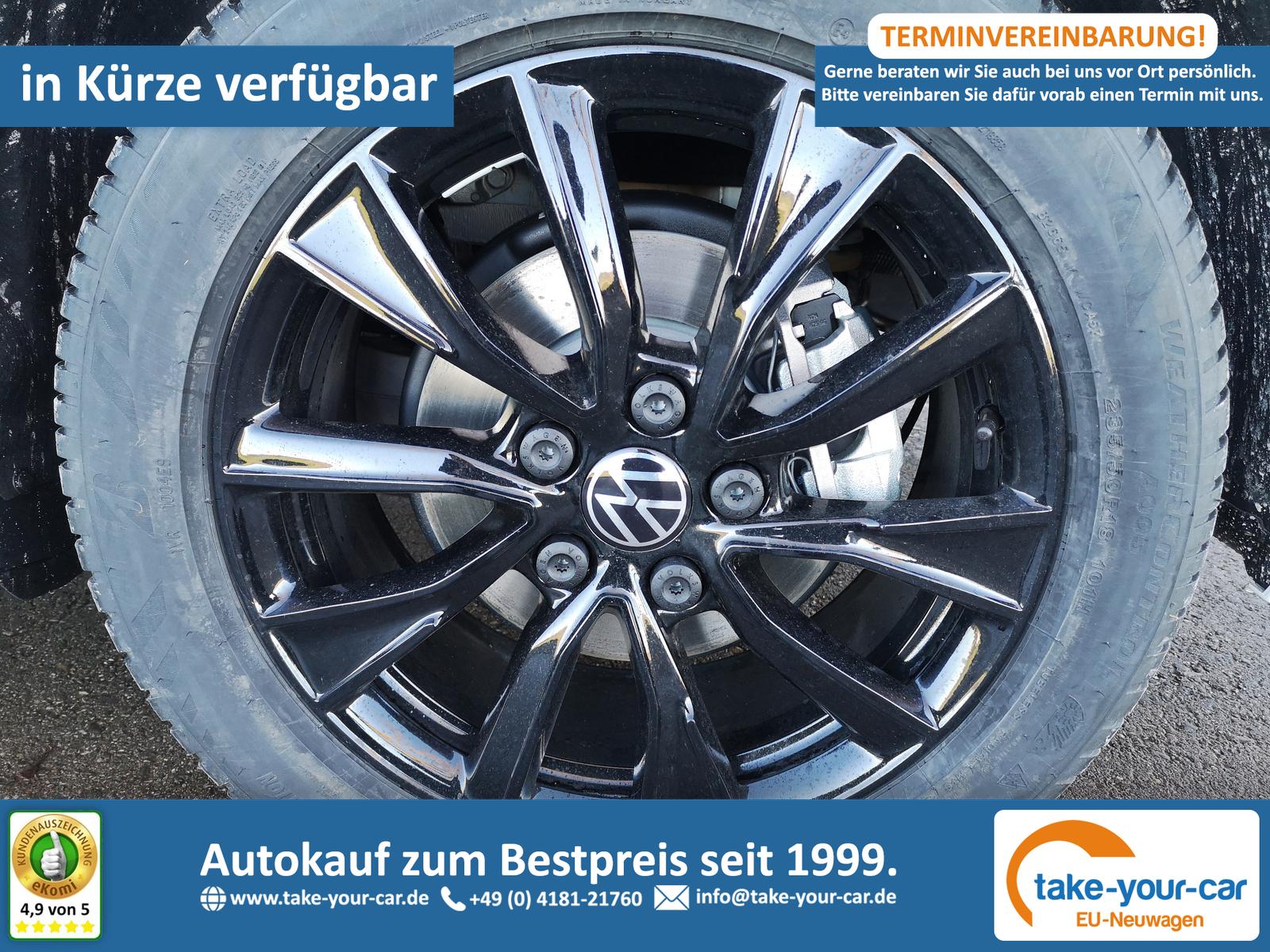 Fahrzeug 8-fach-bereift, Leichtmetallräder 7,5J x 18 (Sport Edition Design TN28, schwarz glanzgedreht) mit Sommerreifen 235 50 R18, Leichtmetallräder 7,5 J x 18 ""Toshima"" schwarz mit Winterreifen (M+S Kennung inkl. Schneeflocke / Allwetterreifen), (0NP) Bulliplakette am Kotflügel, (1U3) Bodenschienen mit Multifunktionstisch inkl. 3 Becherhalter, verschiebbar auf der vollständigen Länge des Schienensystems, (2FT) Multifunktionslederlenkrad beheizbar mit Schaltwippen, (4A3) Sitzheizung vorne, (4GX) Frontscheibe beheizbar und geräuschdämmend, (4K5) Zentralverriegelung Keyless Advance (schlüsselloses Öffnen und Starten),(6I6) Travelassistent, (6KF) Scheinwerferleiste hinterleuchtet, (7AL) Diebstahlwarnanlage, (7J2) Digital Cockpit Pro, (7UY) Radio Navigationssystem Discover Pro, (9AH) Klimaanlage ""Air Care Climatronic"", (N2S) Sitzbezug Bi-Colour ""ArtVelours"", (Z2Q) Anhängerrangierassistent ""Trailer Assistent"" inkl. Anhängerkupplung schwenkbar, Parklenkassistent inkl. Rückfahrkamera, (Z8A) Schiebefenster im Fahrgastraum links und rechts, Fenster ab B-Säule abgedunkelt, (ZBR) 7 Sitzer: Sitzvariante 2-2-3 (Vis-a-Vis entgegen der Fahrrichtung) inkl. 4 Armlehnen.