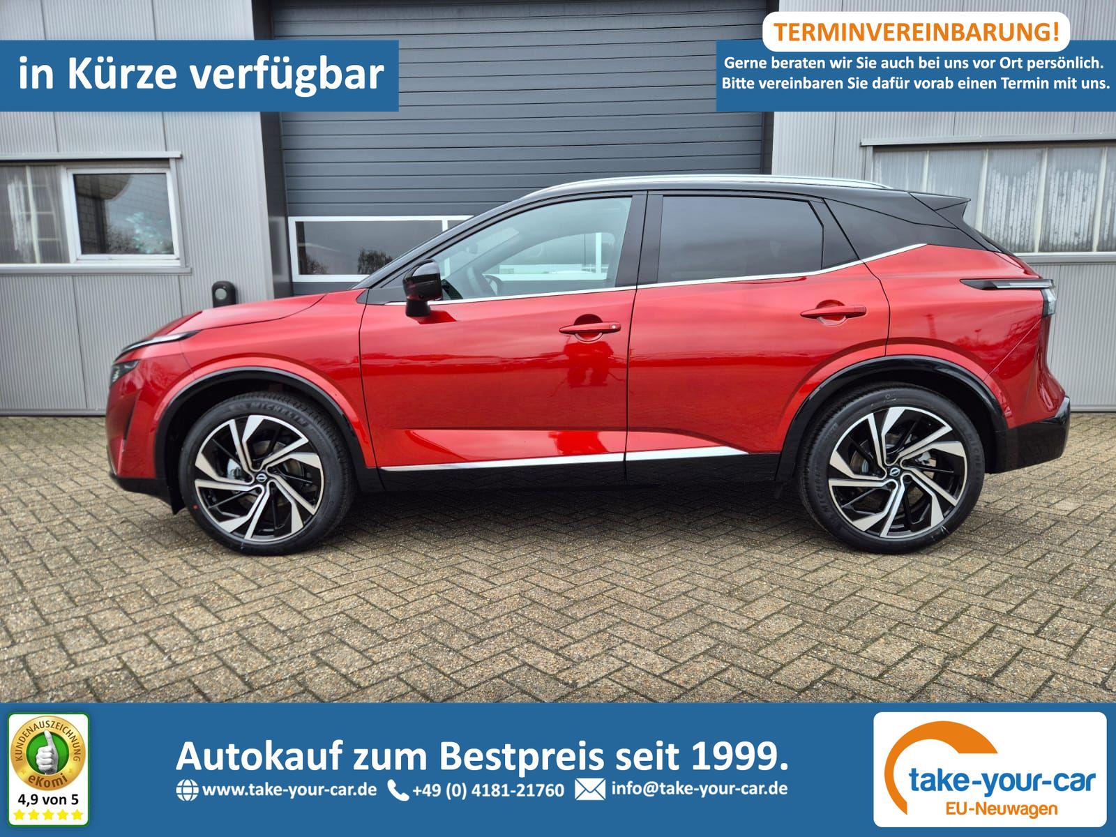 Nissan Qashqai 1.3 DIG-T MHEV 158 PS X-Tronic Tekna Premium Paket 20"LM Teil-Leder PanoGlasdach Klimaautomatik Sitzheizung Lenkradheizung Navi Head-Up Display elektr. Heckklappe ACC PDC v+h 360°Kamera DAB Bluetooth Touchscreen Apple CarPlay Android Auto
