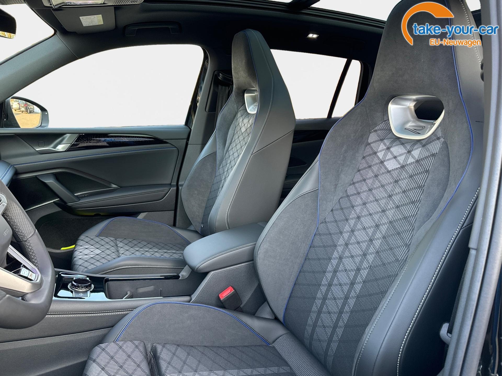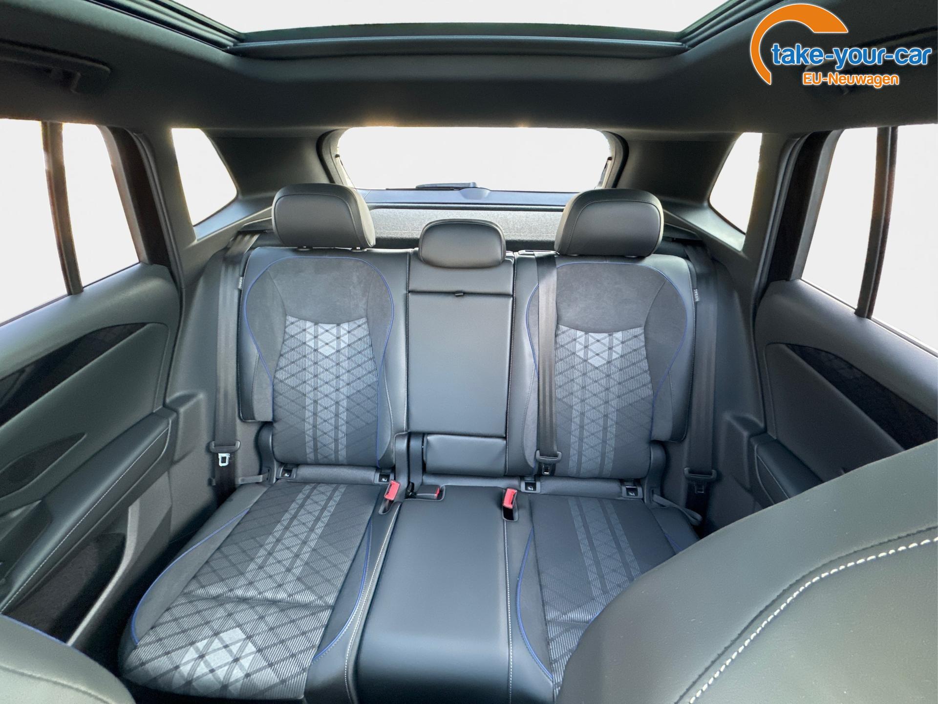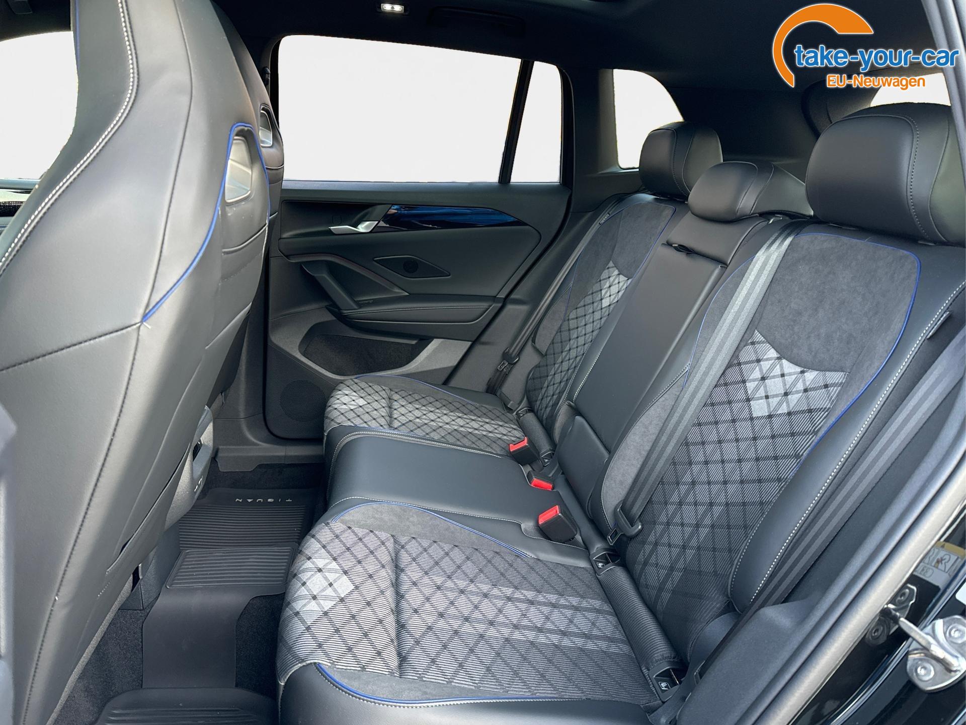 Innenausstattung R-Line Sportsitze mit integrierter Kopfstütze in Schwarz mit blauer Kontur, Sitzmittelbahnen der Vordersitze und der äußeren Rücksitzplätze in Stoff, Sitzwangen in Art Velours