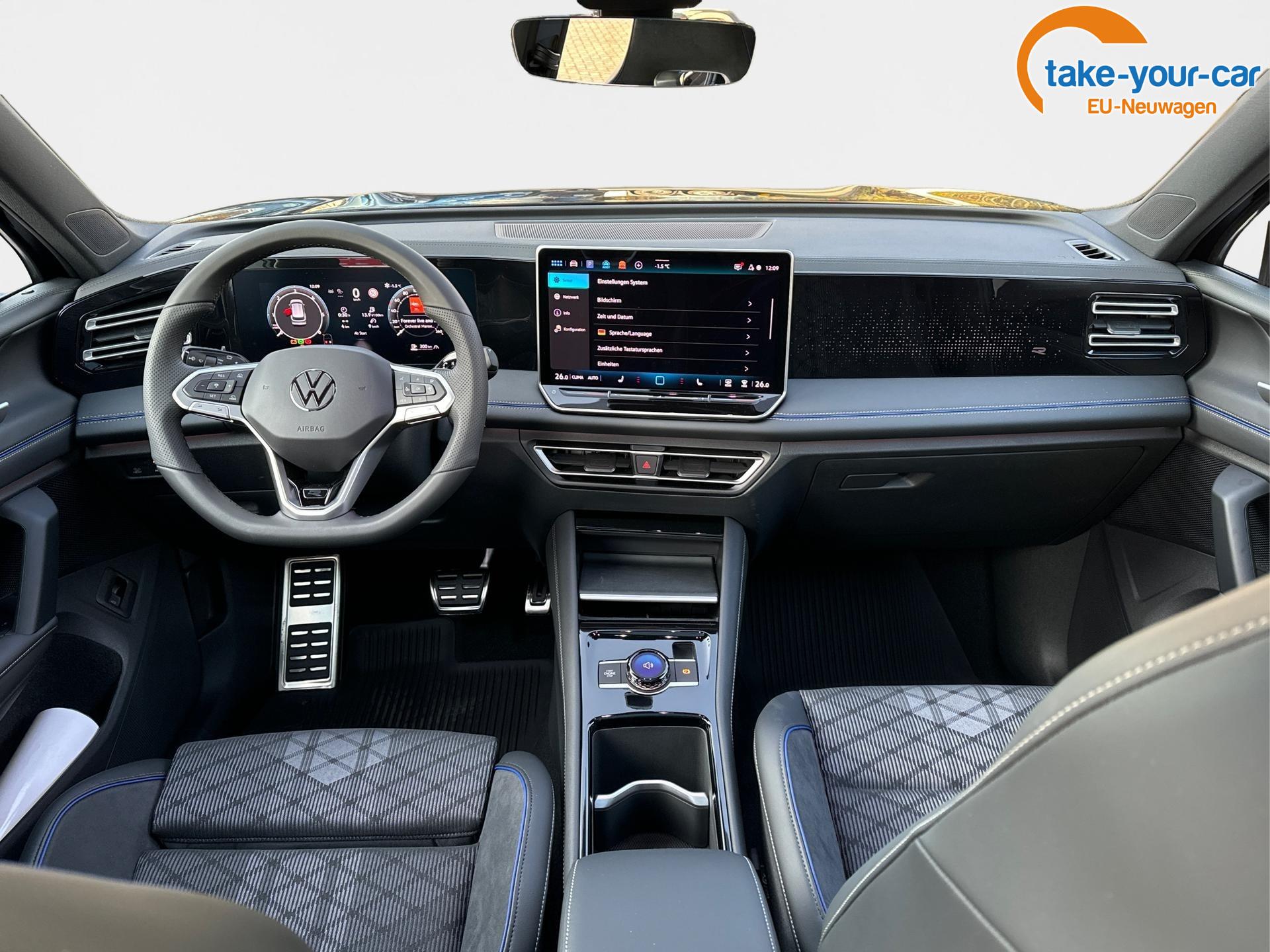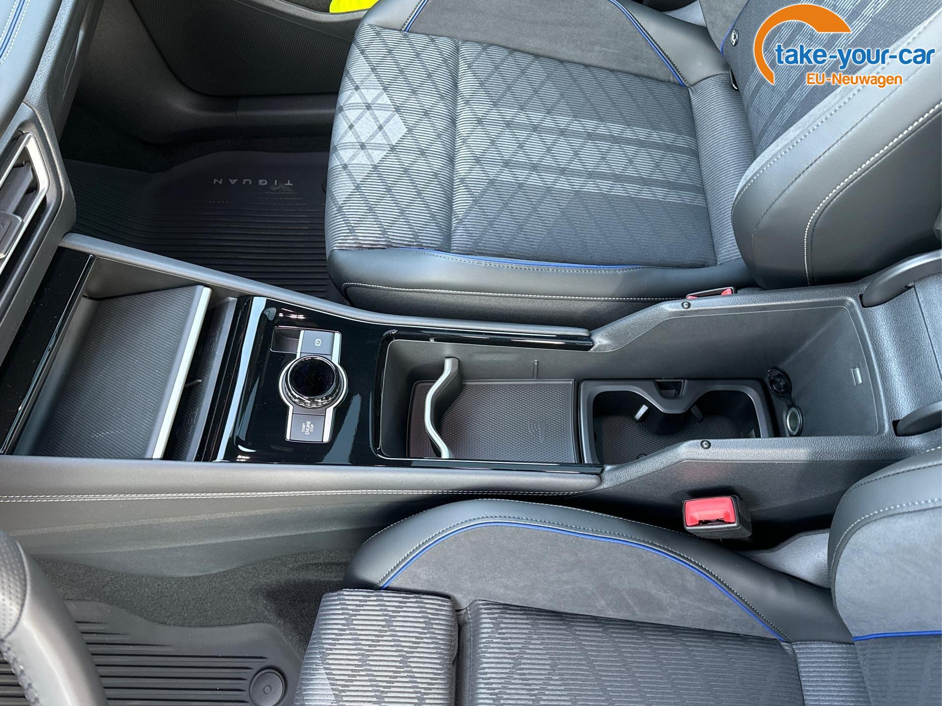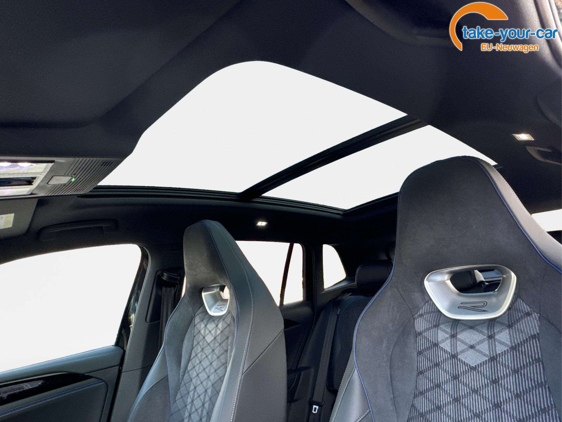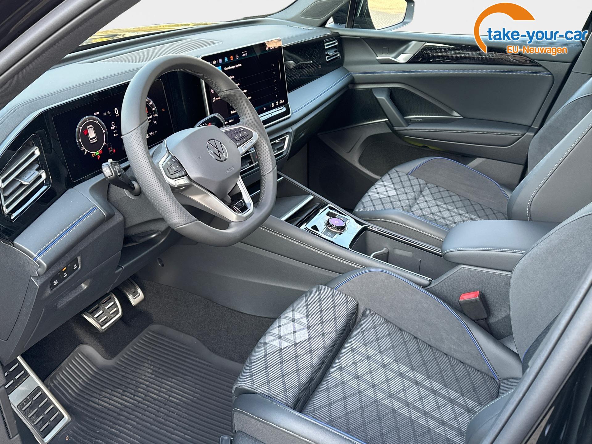 Innenausstattung R-Line Sportsitze mit integrierter Kopfstütze in Schwarz mit blauer Kontur, Sitzmittelbahnen der Vordersitze und der äußeren Rücksitzplätze in Stoff, Sitzwangen in Art Velours
